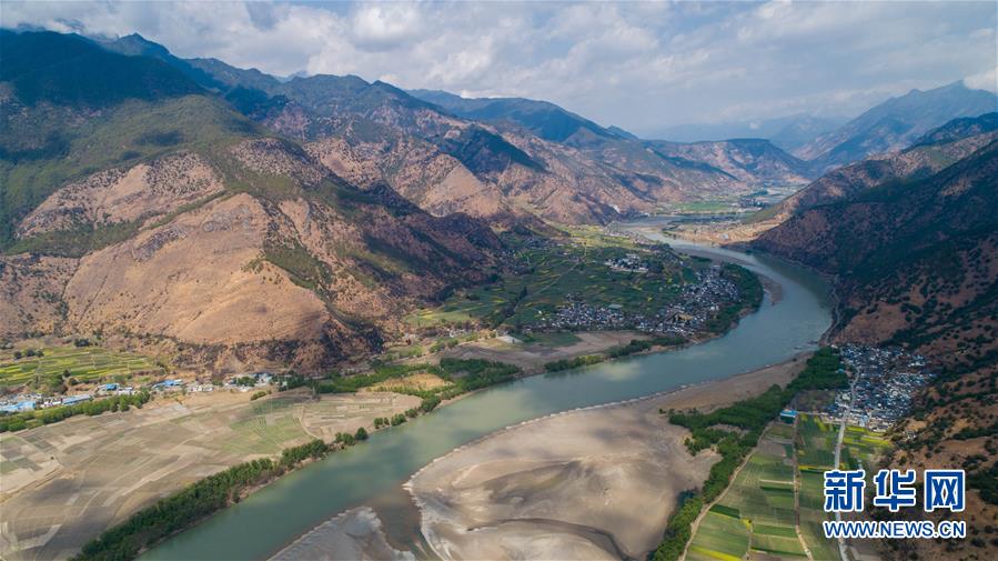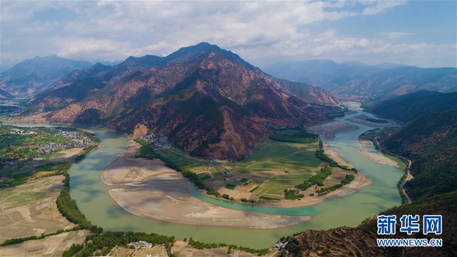 這是無人機拍攝的“長江第一灣”一景(3月17日攝)?!伴L江第一灣”位于云南省麗江市玉龍納西族自治縣石鼓鎮(zhèn),萬里長江從青藏高原奔騰而下,與瀾滄江、怒江一起在橫斷山脈的高山深谷中穿行形成并流的壯麗景觀。金沙江在麗江石鼓鎮(zhèn)突然以急轉彎轉向東北,形成一個宛若“V”字形的大轉彎,得名“長江第一灣”。春日里,“長江第一灣”江水青碧,美景迷人。 新華社記者胡超攝