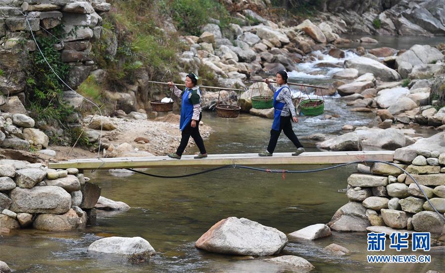 在黔桂烏英苗寨,村民扛著秧苗過河,準(zhǔn)備插秧(4月16日攝)。 新華社記者 黃孝邦 攝