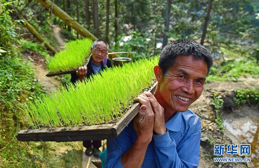 在黔桂烏英苗寨,村民搬運秧苗去插秧(4月17日攝)。 新華社記者 黃孝邦 攝