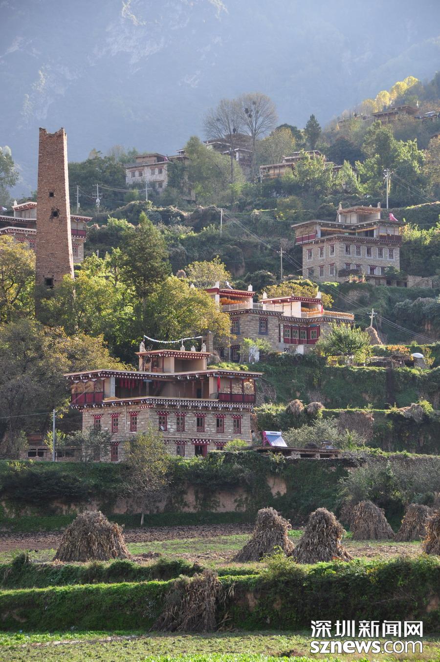 丹巴西距成都348公里,是從事農(nóng)業(yè)生產(chǎn)的嘉絨藏族聚居的地方。當(dāng)?shù)厝司幼〉恼右话阈藿ㄔ谙蜿柕钠铝荷?,由幾十戶甚至上百戶人家組成。一幢幢外形美觀,風(fēng)格統(tǒng)一的寨房和碉樓依著起伏的山勢而建,構(gòu)成一幅幅優(yōu)美的畫卷。李仁奇攝