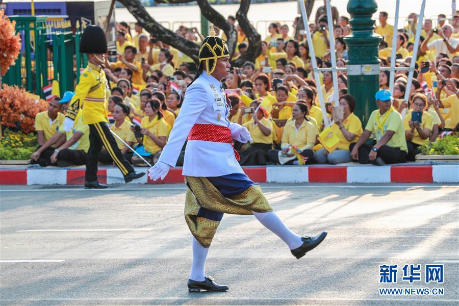 5月5日,儀仗隊在曼谷大王宮附近舉行的泰國國王加冕典禮巡游上列隊前進。 新華社記者 張可任 攝