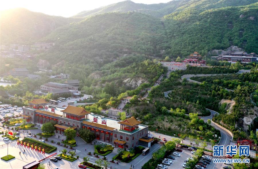 這是5月2日拍攝的盤山風(fēng)景名勝區(qū)正門景觀(無人機拍攝)。新華社記者 岳月偉 攝