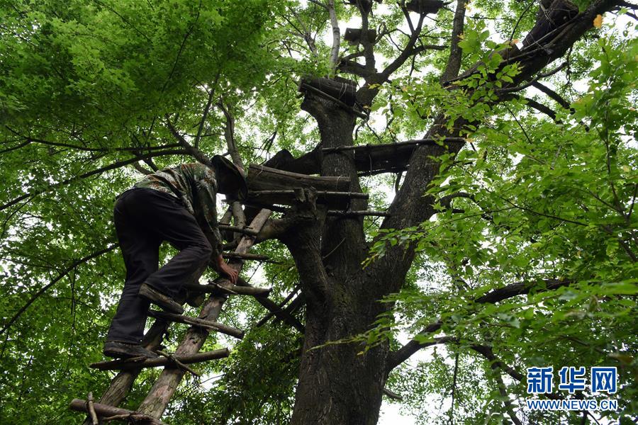 5月10日,在甘肅省隴南市徽縣大河店鎮(zhèn)硬灣村,蜂農(nóng)劉輝林準(zhǔn)備查看放在樹上的蜂箱情況。 甘肅省隴南市徽縣大河店鎮(zhèn)硬灣村位于秦巴山區(qū)深處,2017年,在當(dāng)?shù)卣姆龀窒?,龍崖老巢蜜養(yǎng)殖農(nóng)民專業(yè)合作社成立,蜂農(nóng)們將傳統(tǒng)養(yǎng)蜂技藝和現(xiàn)代加工方式相結(jié)合,并通過(guò)電商等渠道打開銷路,有效帶動(dòng)了當(dāng)?shù)刎毨Т迕衩撠氈赂?。目前整個(gè)合作社共有蜂箱2000余個(gè),每箱每年可帶來(lái)三四千元的收入。 新華社記者 馬寧 攝