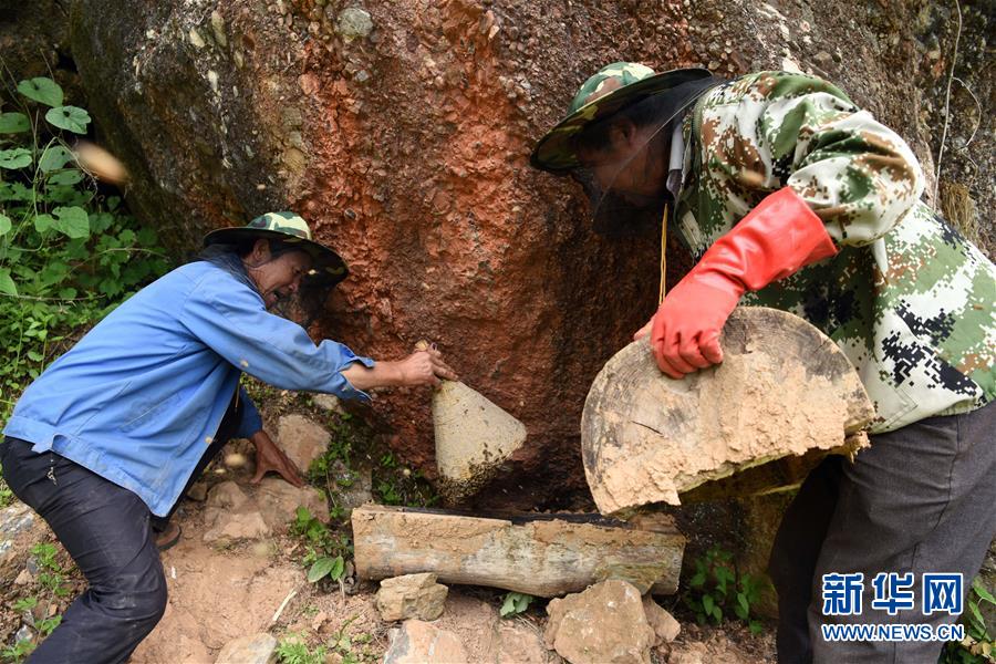 5月10日,在甘肅省隴南市徽縣大河店鎮(zhèn)硬灣村,蜂農(nóng)李成(左)和劉輝林在收蜂。 甘肅省隴南市徽縣大河店鎮(zhèn)硬灣村位于秦巴山區(qū)深處,2017年,在當(dāng)?shù)卣姆龀窒?,龍崖老巢蜜養(yǎng)殖農(nóng)民專業(yè)合作社成立,蜂農(nóng)們將傳統(tǒng)養(yǎng)蜂技藝和現(xiàn)代加工方式相結(jié)合,并通過電商等渠道打開銷路,有效帶動(dòng)了當(dāng)?shù)刎毨Т迕衩撠氈赂?。目前整個(gè)合作社共有蜂箱2000余個(gè),每箱每年可帶來三四千元的收入。 新華社記者 馬寧 攝