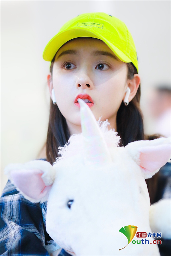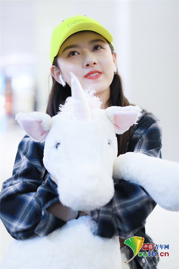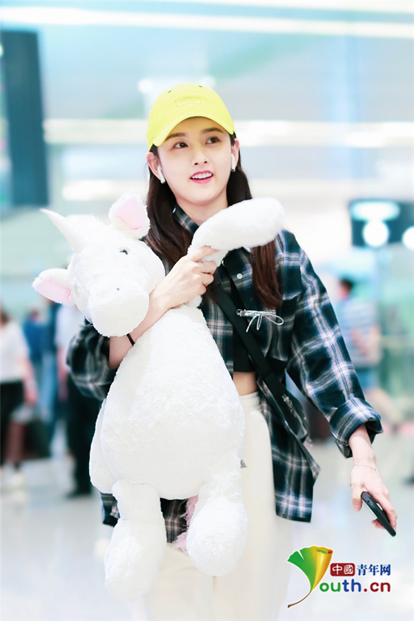 2019年5月12日,北京,宋祖兒現身機場。她穿格子襯衫戴小黃帽揮手大步走,元氣少女活力滿滿,抱玩偶變身獨角獸女孩童趣十足超可愛。