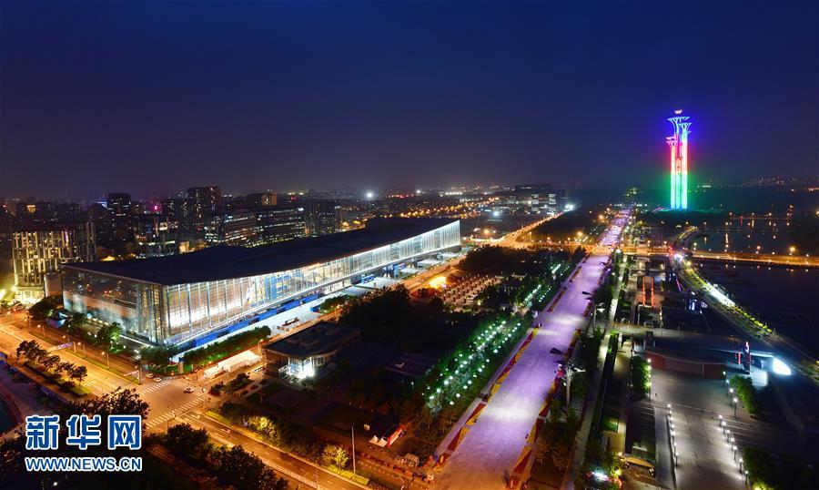 5月14日,國家會議中心和奧林匹克塔交相輝映。 當(dāng)晚,一場“空間光影秀”在北京上演。 新華社記者 李賀 攝