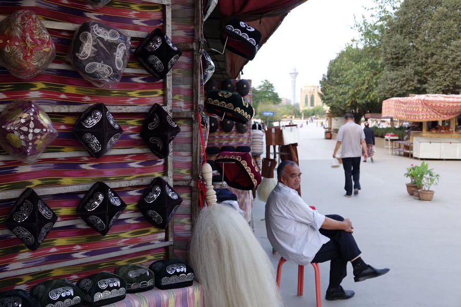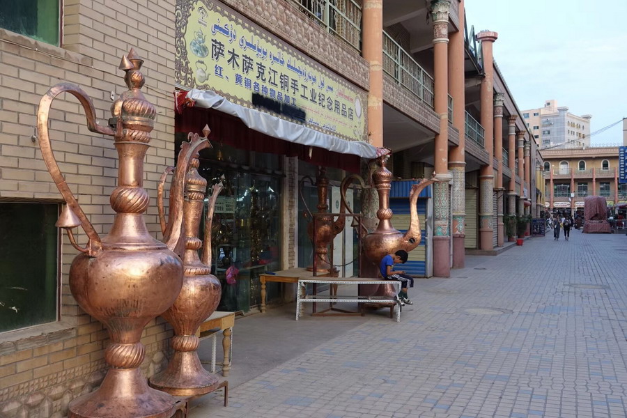兩千多年前,這里是古疏勒國王宮所在地,從500多年前建立艾提尕爾清真寺起始,吾斯塘博依街逐漸成為一條喧鬧繁華的主街,匯聚了當(dāng)?shù)刈畛錾哪芄で山?,是名副其?shí)的手工藝品一條街。李仁奇 攝