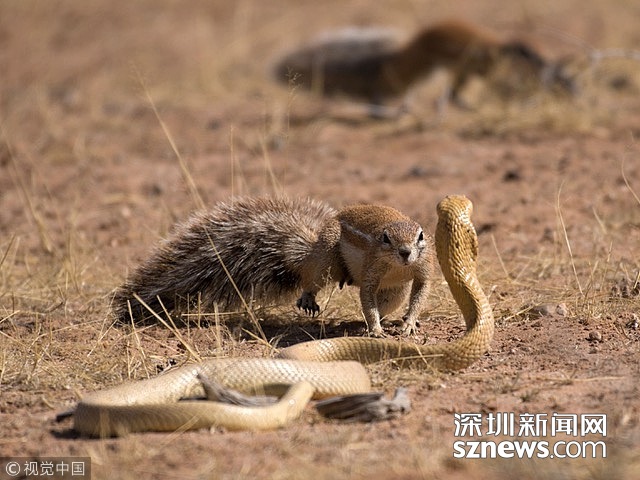 當(dāng)?shù)貢r(shí)間2016年10月25日,南非博茨瓦納的卡格拉格帝越界公園, 眼鏡蛇和地松鼠之間發(fā)生激烈打斗,但都沒有受傷。野生動(dòng)物攝影師Hannes Rossouw拍攝了這一過程。