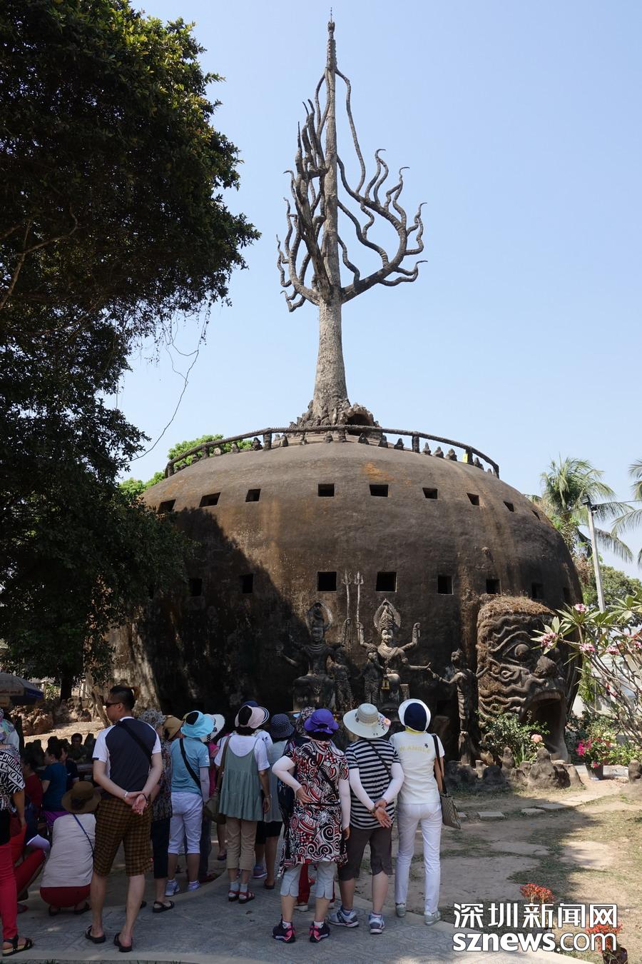 香昆寺實(shí)際上是一座佛像公園,位于萬(wàn)象東南約 24 公里處,寺內(nèi)供奉的各種超凡脫俗的佛像和印度教雕像大多取材于宗教故事。圓形尖塔、塔頂有一座金佛坐鎮(zhèn)的詭異建筑寓意著地獄、人間和天堂。 李仁奇 攝