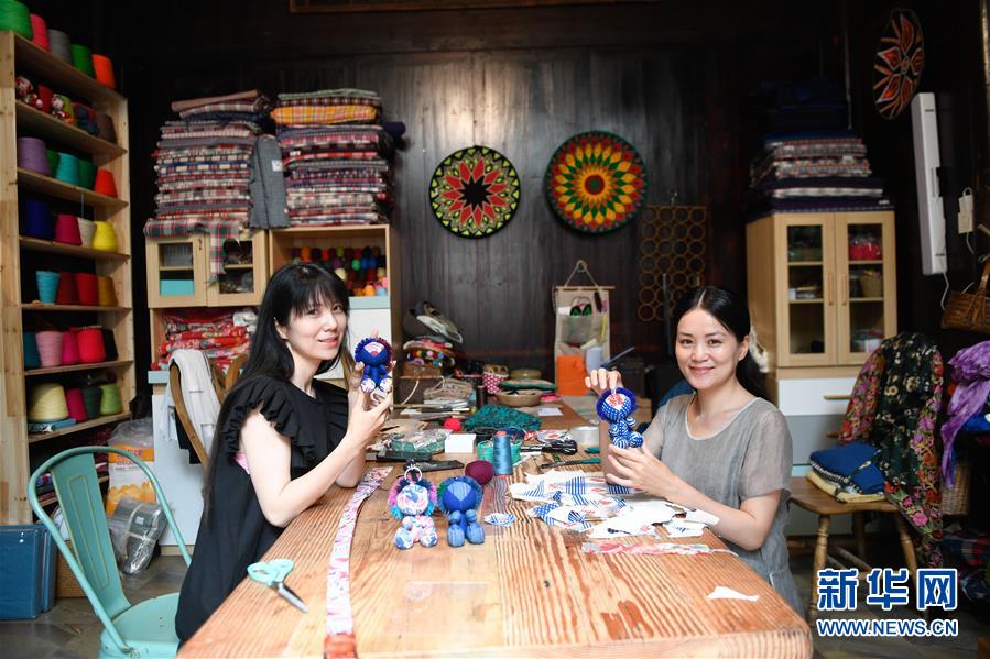 5月26日,在石舍村共同經(jīng)營“三只蝸牛”手工藝品商店和客棧的姐妹陳紫畫(右)、陳莫寒在展示制作的手工藝品。 石舍村是浙江省桐廬縣富春江鄉(xiāng)村慢生活體驗(yàn)區(qū)中的三個村落之一,位置偏僻,依溪而居,風(fēng)景秀美。近年來,石舍村結(jié)合古建筑保護(hù)工作,在清潔、美化村莊的基礎(chǔ)上,對一些廢棄古建筑進(jìn)行修繕,引入咖啡館、民宿等文化創(chuàng)意類項(xiàng)目,優(yōu)良的生態(tài)環(huán)境和濃郁的文化氛圍吸引大批游客前來體驗(yàn),小山村走上了一條發(fā)展美麗經(jīng)濟(jì)之路。2018年,石舍村接待游客10萬8千余人次,旅游經(jīng)營凈收入1260余萬元。 新華社記者 黃宗治 攝