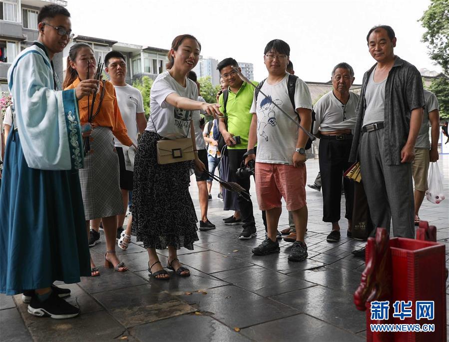 6月9日,在成都寬窄巷子,游客排隊(duì)參與投壺祈香游戲。新華社記者 江宏景 攝