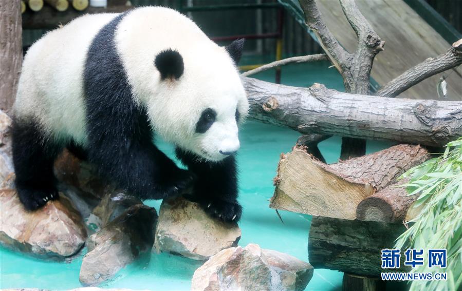 6月18日,大熊貓“星光”走在館內(nèi)水池邊的石頭上。 當(dāng)日,來自四川的大熊貓兄弟“和風(fēng)”與“星光”飛抵上海,正式開始了在上海動物園為期三年的生活。為迎接這對“風(fēng)光兄弟”,上海動物園將原有的大熊貓館擴建并裝修一新,空調(diào)、水池、游樂場以及竹葉儲存間等配置齊全。 新華社記者 方喆 攝