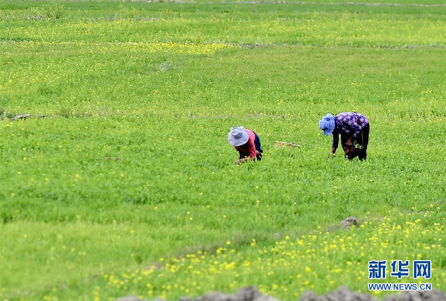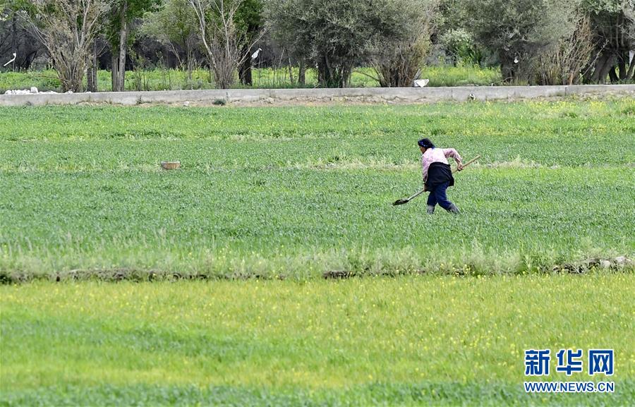 農牧民在日喀則桑珠孜區(qū)郊外的青稞地里拔除雜草(6月22日攝)。新華社記者 張汝鋒 攝