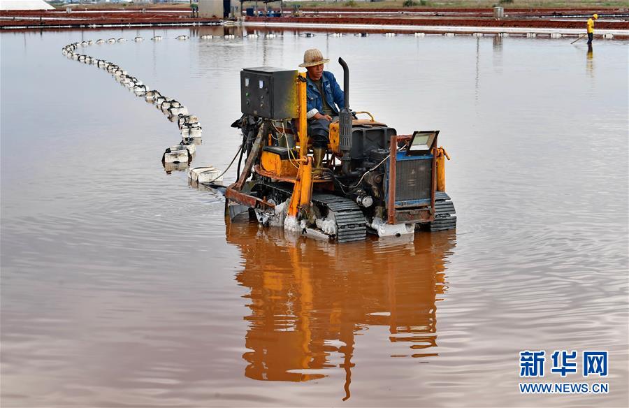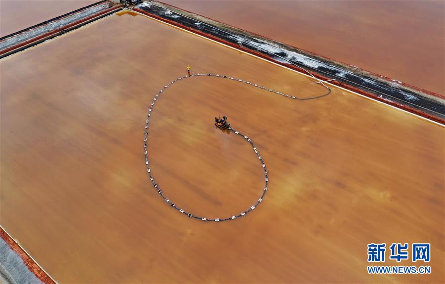 7月3日,唐山海港經(jīng)濟開發(fā)區(qū)大清河鹽場的工人在洗鹽場工作。新華社記者 楊世堯 攝