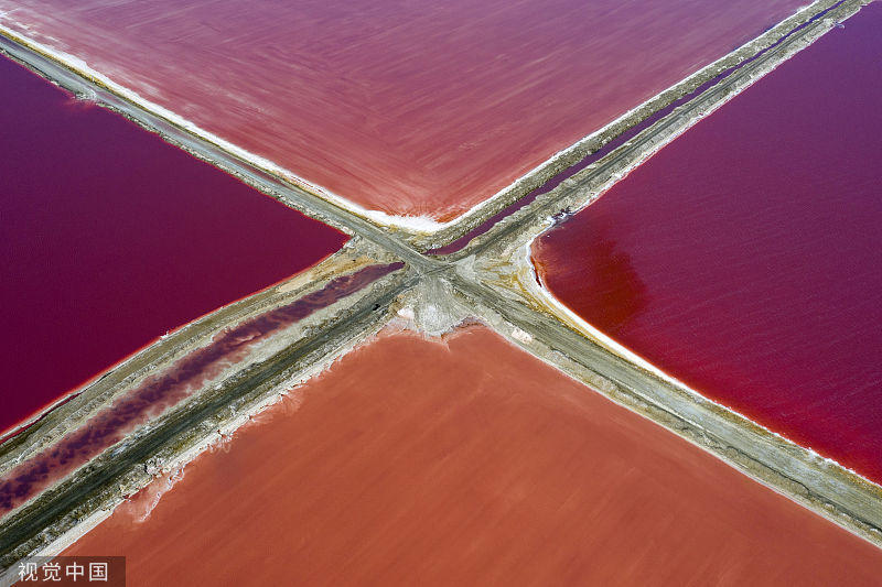 這片俯拍的鹽田總面積達3500公頃(35平方千米),因為當?shù)睾T搴望}的濃度不同造成了鹽田的不同色彩。