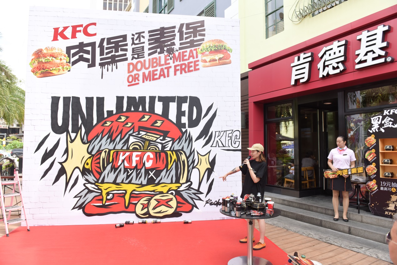 “肯德基是我非常喜歡的品牌,新潮、時(shí)尚。這一次與KFC的涂鴉合作,我在漢堡涂鴉的畫面中融入了像滑板、打碟機(jī)這樣的潮流元素,來(lái)演繹KFC厚菇堡這一款極具創(chuàng)新性的漢堡。用噴漆罐表現(xiàn)一整塊芝士厚菇,一口咬下能噴出濃郁的芝士;火焰燃燒的造型代表漢堡中肆意的醬汁,增加視覺沖擊感,呈現(xiàn)出一個(gè)沒有肉,但很real的霸氣素漢堡?!闭劶皠?chuàng)作理念,ROCKLEE說(shuō)道,“這種結(jié)合我覺得很有意義,一方面展現(xiàn)了涂鴉這種街頭文化多元的一面,另一方面也傳遞出KFC在漢堡界young OG的全新形象?!睆膭?chuàng)作到完工,整個(gè)過(guò)程都引來(lái)路人圍觀、拍照。從朋友圈看到消息的潮人又不斷向此聚集、花式打卡。