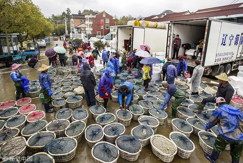 浙江臺(tái)州,三門縣花橋鎮(zhèn)柵下村的文化禮堂前,村民們冒雨和商販交易蟶苗,現(xiàn)場(chǎng)一片繁忙。據(jù)了解,花橋蟶苗屬于野生苗,存活率高,易成長(zhǎng),極受市場(chǎng)歡迎,一到捕撈季節(jié),遼寧、山東、江蘇和浙江的養(yǎng)殖戶和蟶苗小販爭(zhēng)相到花橋購(gòu)買優(yōu)質(zhì)蟶苗。