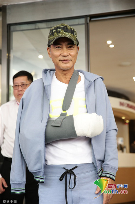 2019年7月24日,香港,任達(dá)華出院。他身穿藍(lán)色運動外套走出醫(yī)院,頭戴鴨舌帽,受傷的右手則套上白色護(hù)臂帶,面帶笑容,精神狀態(tài)非常好。