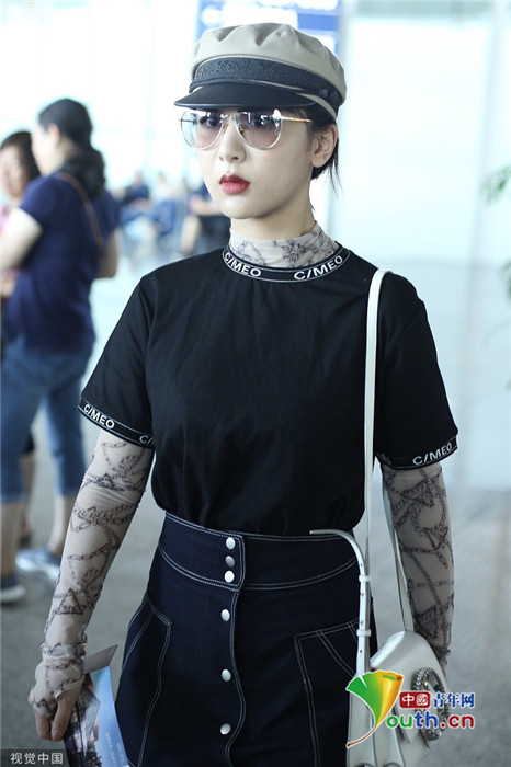 2019年7月25日,北京,楊紫現(xiàn)身機場。她穿黑色短T配牛仔裙變時髦女郎,戴報童帽架墨鏡”港風(fēng)女sir“即視感,人氣爆棚。