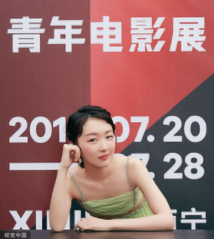 周冬雨穿牛油果綠吊帶裙清新可人,趴桌臺(tái)俏皮擺拍落落大方;圖片來源:視覺中國