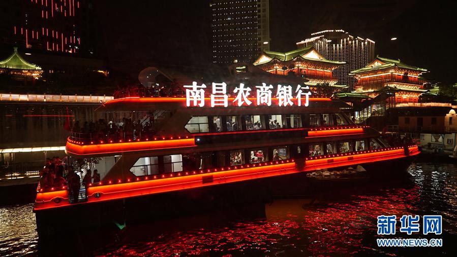 在江西南昌,游客在游輪上觀(guān)賞夜景風(fēng)光(8月6日攝)。 新華社記者萬(wàn)象 攝