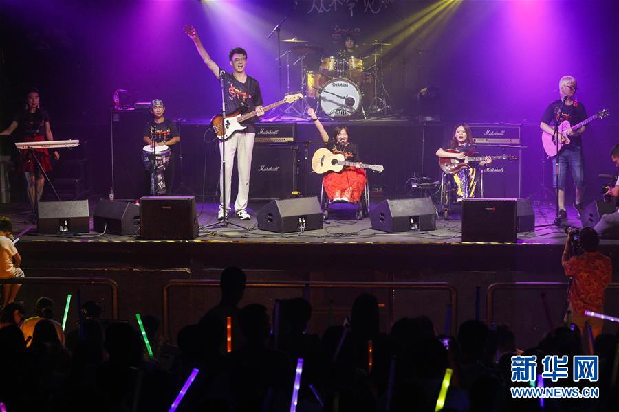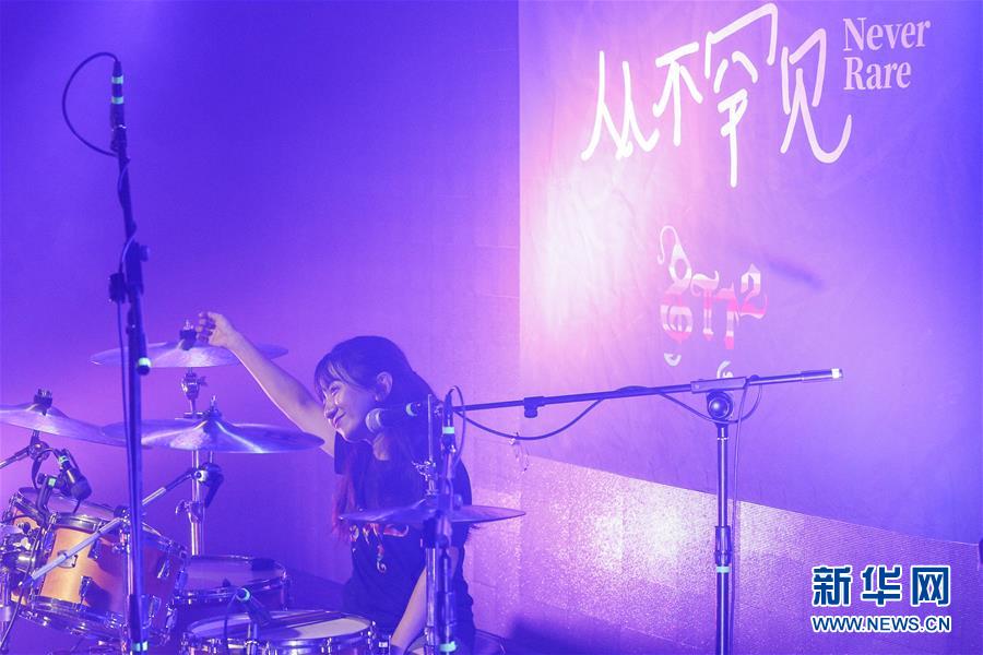 8月14日,8772樂隊(duì)成員蘇佳宇(中)在演唱會(huì)上表演。 新華社記者張玉薇攝