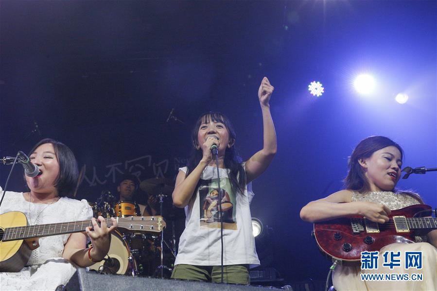 8月14日,8772樂隊(duì)發(fā)起人、隊(duì)長王奕鷗(中)和樂隊(duì)成員崔瑩(左)、程利婷在演唱會(huì)上表演。新華社記者張玉薇攝