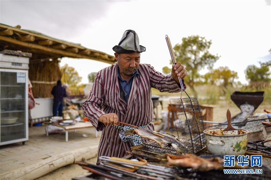 羅布人村寨位于新疆巴音郭楞蒙古自治州尉犁縣,塔里木河從這里流過,沙漠、胡楊、湖泊的奇妙組合吸引了不少游客。生活在這里的羅布人阿木東·艾不東更成為大家關(guān)注的焦點。 阿木東·艾不東61歲,聲音洪亮,面色紅潤,平時喜歡穿著羅布麻紡織而成的對襟長袍和羊毛氈制成的船形帽子,這是羅布人的傳統(tǒng)裝扮。 如今,許多羅布人不再以打魚為生,他們有的放牧,有的種植,有的開設(shè)店鋪……像阿木東一樣在沙漠中漁獵的羅布人已經(jīng)很少了。 制作羅布人傳統(tǒng)美食——紅柳烤魚是阿木東的拿手絕活。一根紅柳,穿起一條野魚,起一堆炭火,撒少許鹽巴,就可以靜待皮焦肉嫩的紅柳烤魚了。除了傳統(tǒng)口味外,阿木東對羅布烤魚進行了改良?!拔颐刂屏艘环N烤魚醬,里面除了辣椒、鹽巴、孜然,還有其他佐料?!碑?dāng)問起具體是哪些配方時,阿木東笑著說:“還有就是塔里木河的味道!” 阿木東是一個閑不住的人。旅游旺季過后,他會制作卡盆(胡楊制作的獨木舟)模型、胡楊筆筒等,等旺季來臨再把這些小物件賣出去。 兩千年前,塔里木河與孔雀河載著天山、昆侖山的雪水,把羅布泊充盈得煙波浩渺。羅布人靠羅布泊水域和周圍的濕地及原始胡楊林繁衍生息。后來,塔里木河下游河床被風(fēng)沙淤塞,干旱斷絕了綠色。2001年,塔里木河流域近期綜合治理項目啟動。隨著下游河道兩岸地下水位的抬升,相當(dāng)數(shù)量的胡楊從死亡的邊緣“醒來”,重新護佑這里的綠洲與百姓。 近幾年,阿木東生活的地方基礎(chǔ)設(shè)施大為改善,柏油馬路修到了塔里木河畔。前來領(lǐng)略大漠胡楊的游客也越來越多。據(jù)了解,截至7月底,尉犁縣今年已接待游客78萬人次,旅游總收入超過1.1億元,同比分別增長63.14%和119.42%。 新華社記者 趙戈 攝