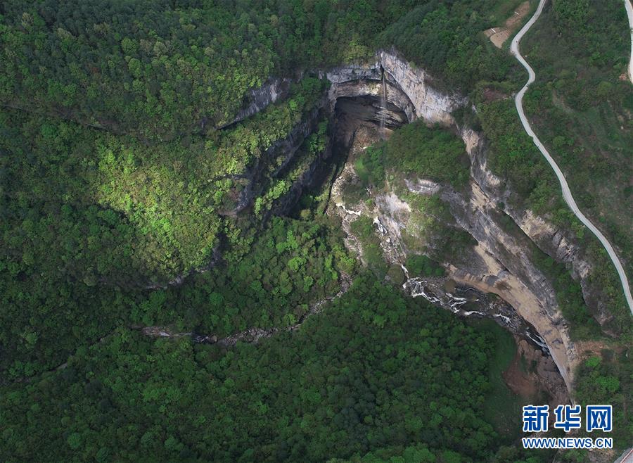 4月22日無(wú)人機(jī)拍攝的地洞河天坑。 新華社記者 張博文 攝