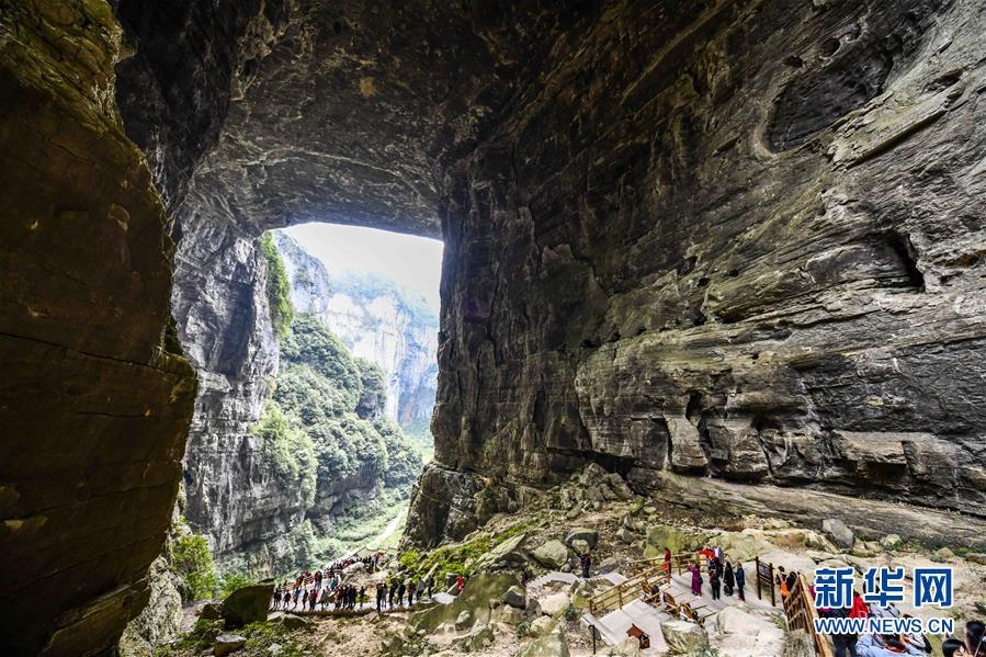 游客在天生三橋景區(qū)內(nèi)的天龍橋景點(diǎn)游覽(3月27日攝)。 新華社記者劉潺攝