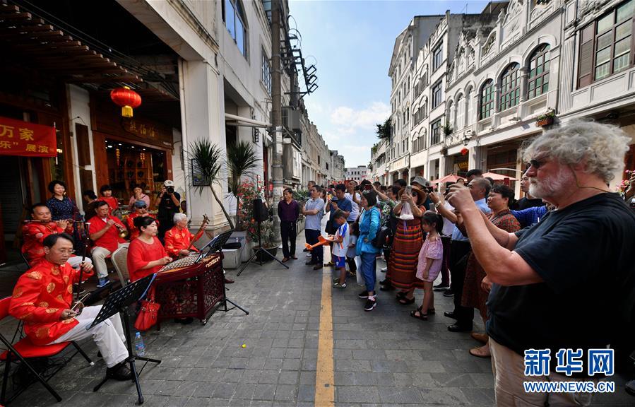 游客在??谥猩铰夫T樓老街觀看海南八音樂(lè)器表演(2019年2月6日攝)。新華社記者郭程攝