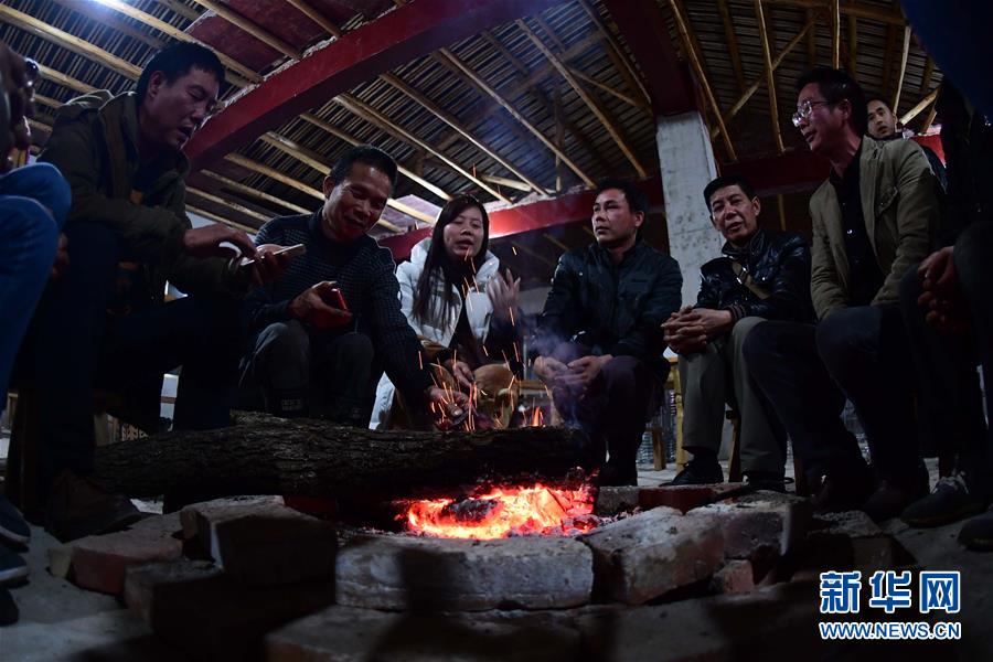 龍革雄(左二)和回家開辦農(nóng)家樂的村民商量相關(guān)事宜(2017年2月25日攝)。 新華社記者 黃孝邦 攝