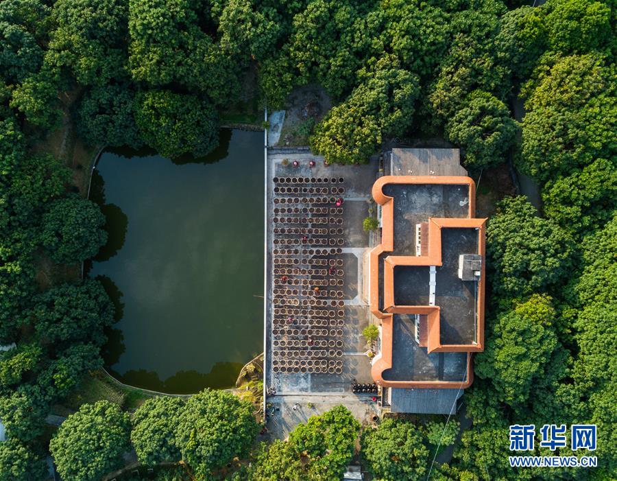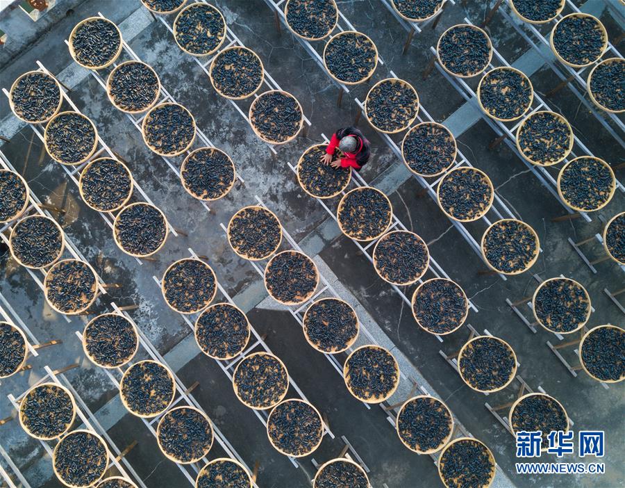 在福建省永春縣岵山鎮(zhèn)茂霞村熟地文創(chuàng)園,村民在晾曬用當(dāng)?shù)貍鹘y(tǒng)手藝制作的藥材——熟地(1月28日無(wú)人機(jī)拍攝)。 新華社記者 宋為偉 攝