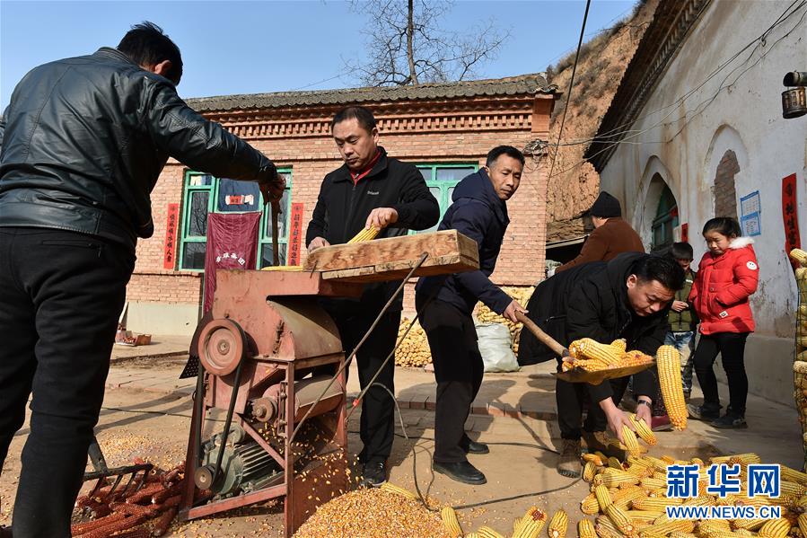 在武鄉(xiāng)縣大有鄉(xiāng)王莊溝村,駐村第一書(shū)記靳建中(左二)和扶貧工作隊(duì)隊(duì)員徐乃勤(左三)、常建林(左四)在村民家里幫助村民給玉米脫粒(2月17日攝)。 新華社記者 詹彥 攝