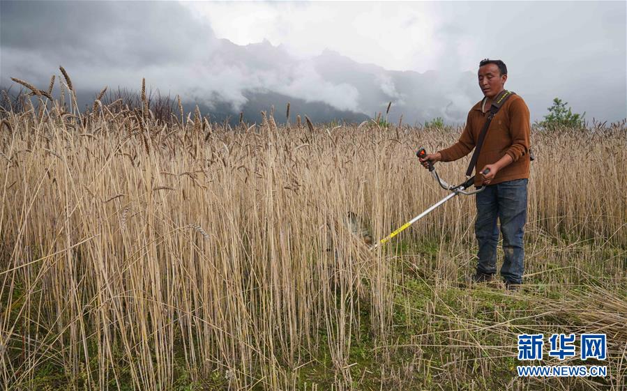 乃村村委會(huì)主任多吉頓珠在自家田地里收割小麥(8月26日攝)。新華社記者 多吉占堆 攝