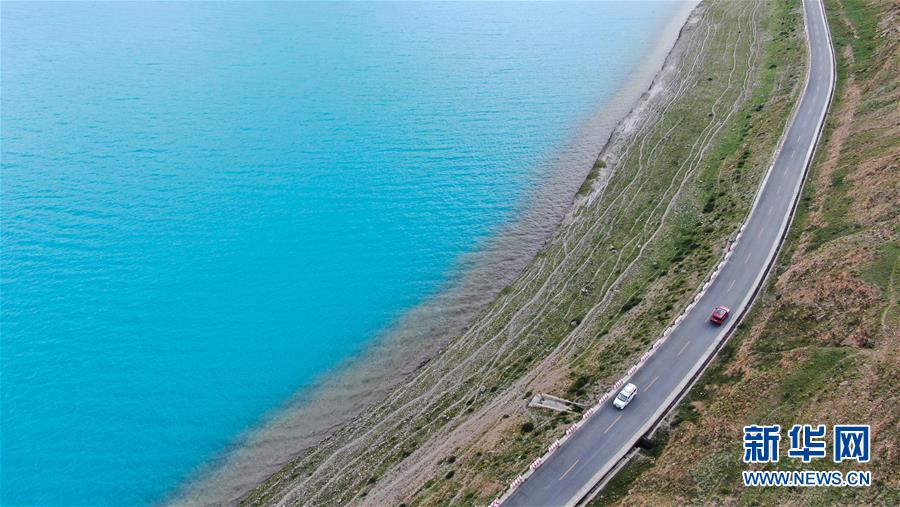 8月31日無人機拍攝的羊卓雍錯及邊上的307省道。新華社記者 晉美多吉 攝
