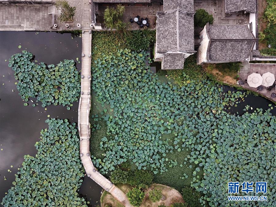 這是無(wú)人機(jī)拍攝的呈坎村內(nèi)的荷塘(8月28日攝)。新華社記者劉軍喜攝