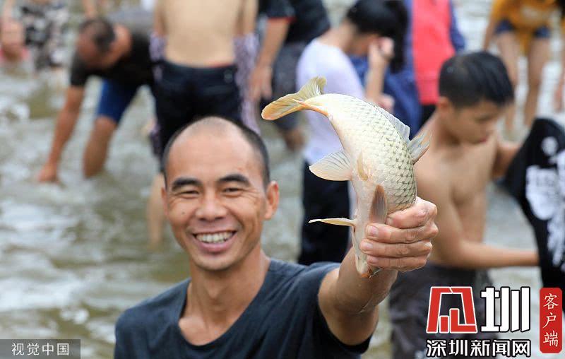 有人撒魚(yú)網(wǎng),有人用網(wǎng)兜,還有人直接徒手捉魚(yú),手段各異引路人圍觀。
