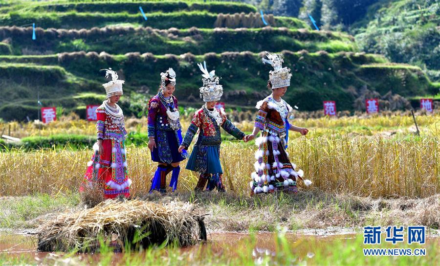 10月28日,在廣西融水苗族自治縣拱洞鄉(xiāng)龍令村,苗家姑娘前往田間觀看摸螺抓魚(yú)比賽。新華社記者 黃孝邦 攝