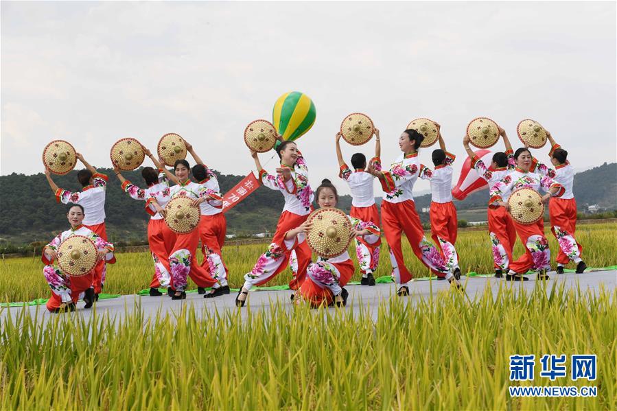 9月15日,人們?cè)谔镆袄锉硌菸璧浮洞淀懱J笙慶豐收》。新華社記者 楊宗友 攝