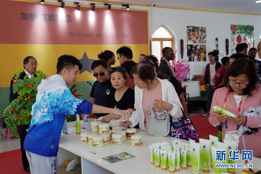 9月18日,參觀者在北京世園會加納館內選購商品。 當日,2019年中國北京世界園藝博覽會“加納國家日”活動在北京世園會園區(qū)舉行。 新華社記者 鞠煥宗 攝