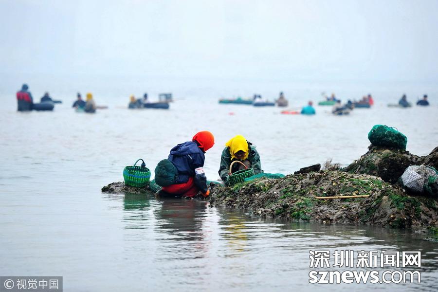 2018年12月22日,山東青島西海岸新區(qū)唐島灣南岸,市民蹚過(guò)海水帶回灣底挖到的海蠣子。