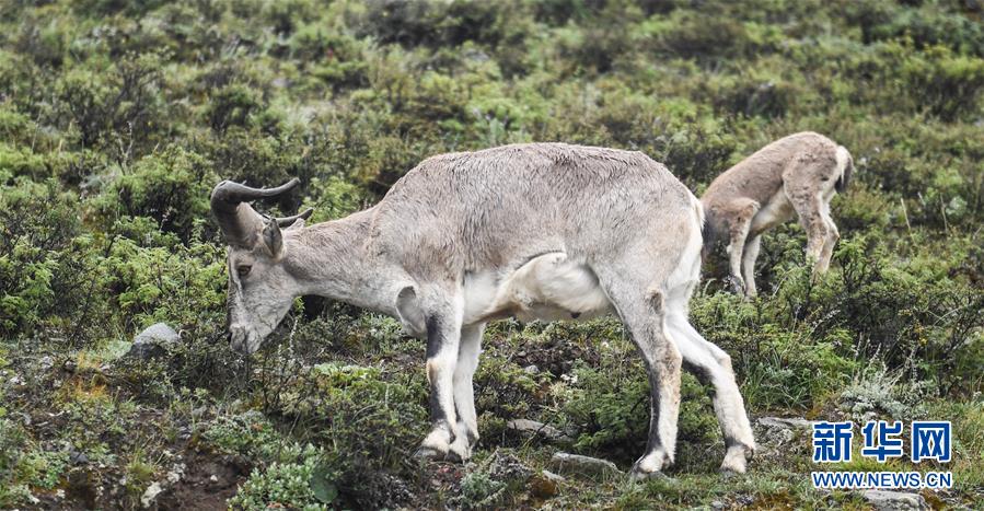 兩只巖羊在西藏山南市洛扎縣色鄉(xiāng)海拔4000米左右的盤山路邊,悠閑地吃著野果青草(9月22日攝)。新華社記者 晉美多吉 攝