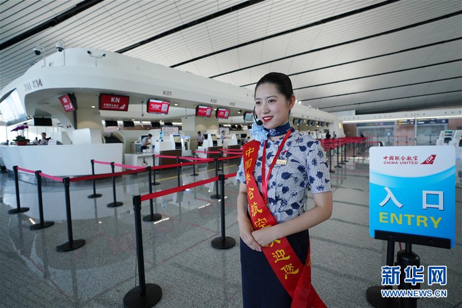 9月25日,中國聯(lián)合航空公司的工作人員在北京大興國際機(jī)場(chǎng)航站樓內(nèi)迎接乘客。新華社記者鞠煥宗攝