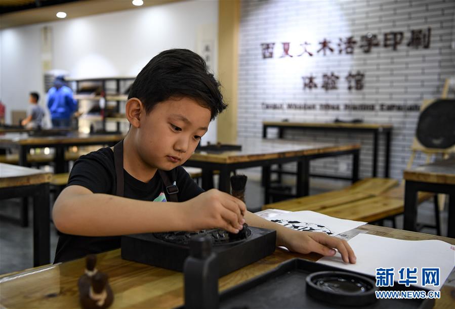 10月2日,游客在寧夏銀川市西夏陵景區(qū)體驗西夏文木活字印刷。 新華社記者 馮開華 攝