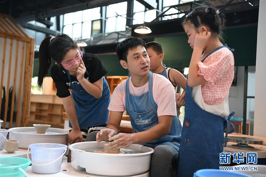 在江西景德鎮(zhèn)陶溪川文創(chuàng)街區(qū)的陶公塾實訓(xùn)基地,孩子們在老師(中)的指導(dǎo)下制作陶藝作品(7月26日攝)。新華社記者 萬象 攝