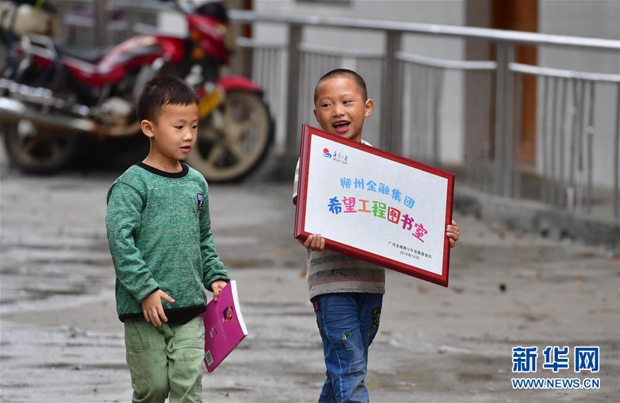 黔桂烏英苗寨的孩子捧著“希望工程圖書室”的牌匾,準(zhǔn)備懸掛(10月12日攝)。新華社記者 黃孝邦 攝