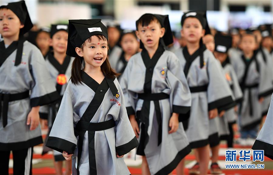 10月13日,參加儀式的小朋友在誦讀《三字經(jīng)》。當日,??诤嬌賰核囆g中心為500名小朋友舉行“開筆禮”,通過“點朱砂,啟智慧”“習書法,描人字”等儀式讓孩子們體驗中國傳統(tǒng)文化。新華社記者郭程攝