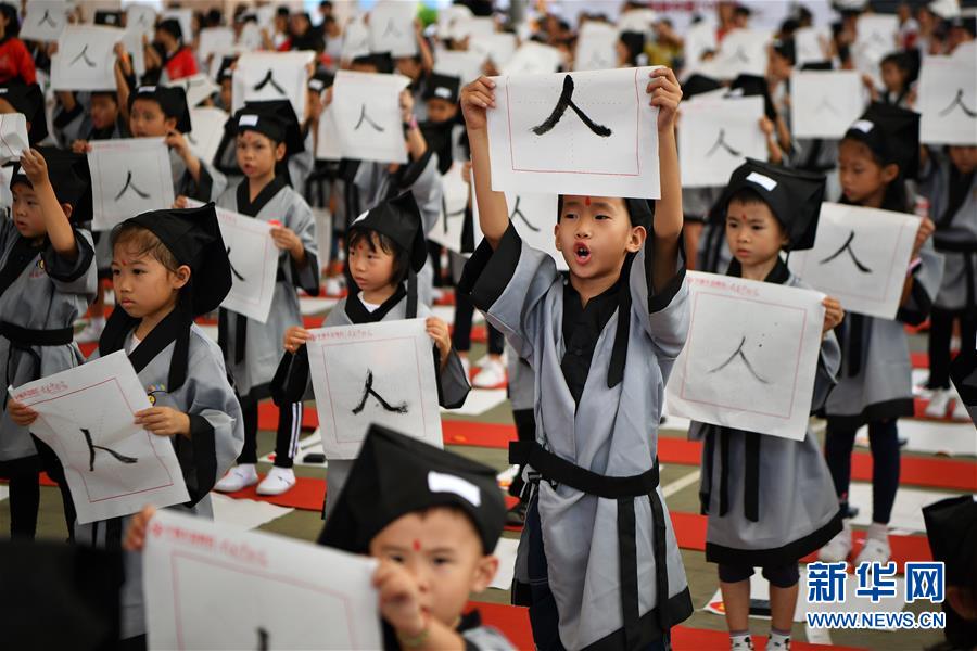 10月13日,參加儀式的小朋友在書寫“人”字。當日,??诤嬌賰核囆g中心為500名小朋友舉行“開筆禮”,通過“點朱砂,啟智慧”“習書法,描人字”等儀式讓孩子們體驗中國傳統(tǒng)文化。新華社記者郭程攝
