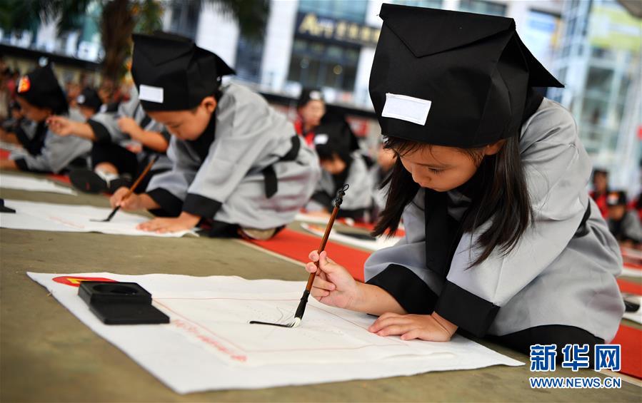 10月13日,參加儀式的小朋友在蘸墨寫字。當日,??诤嬌賰核囆g中心為500名小朋友舉行“開筆禮”,通過“點朱砂,啟智慧”“習書法,描人字”等儀式讓孩子們體驗中國傳統(tǒng)文化。新華社記者郭程攝